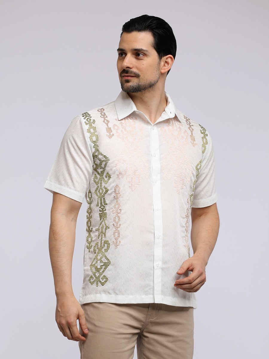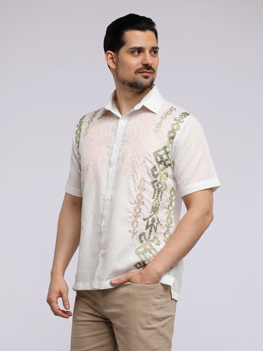 OLIVE IKAT EMBROIDERY SHIRT for a statement relax and simple shape,designed with influence of traditional Indian Ikat patterns.