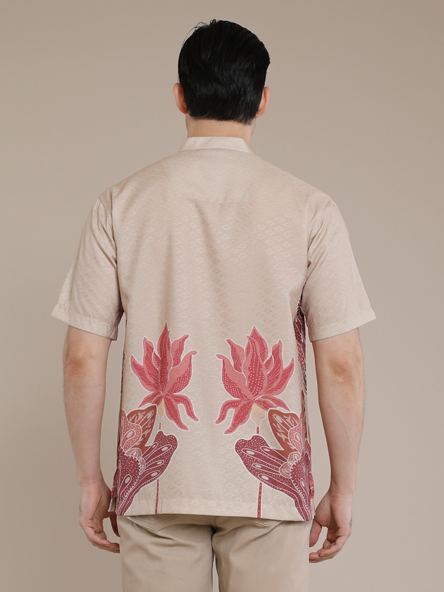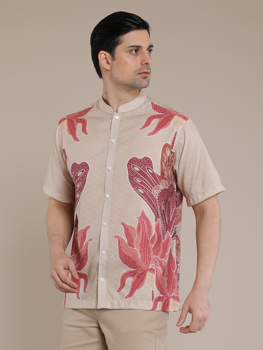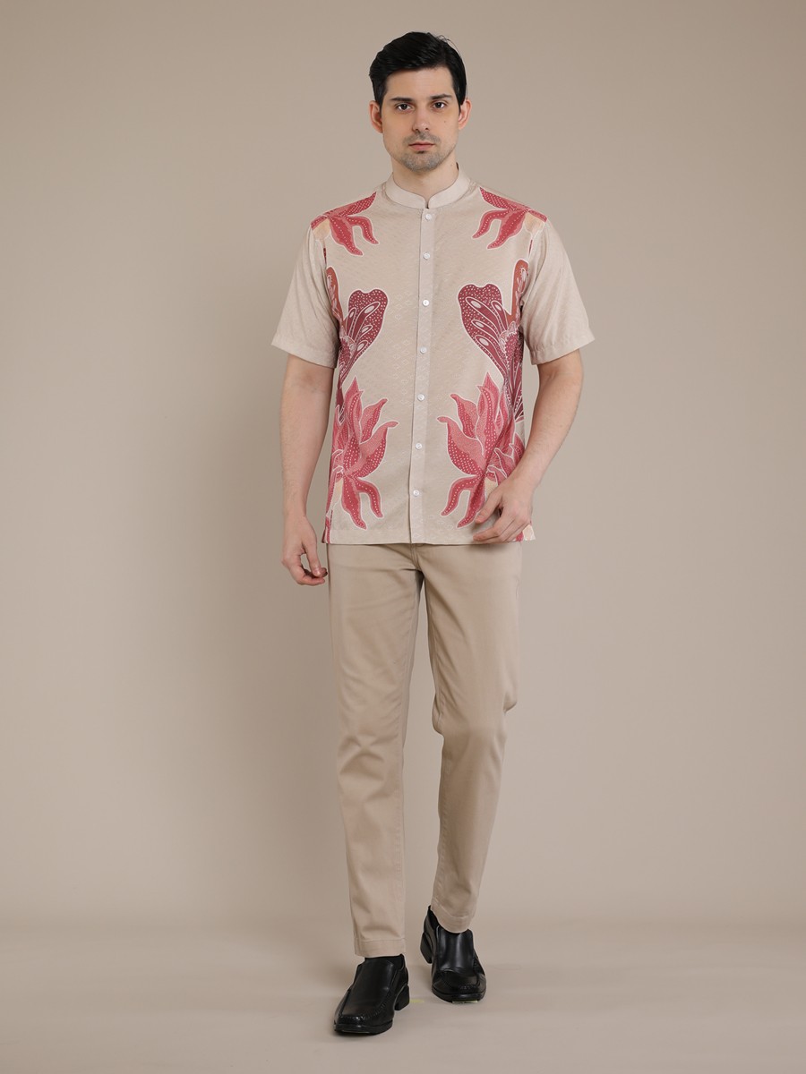 This PEKALONGAN PERANAKAN KAFTAN SHIRT short-sleeved modern festive top that features a minimalist base with bold,asymmetrical floral motifs.